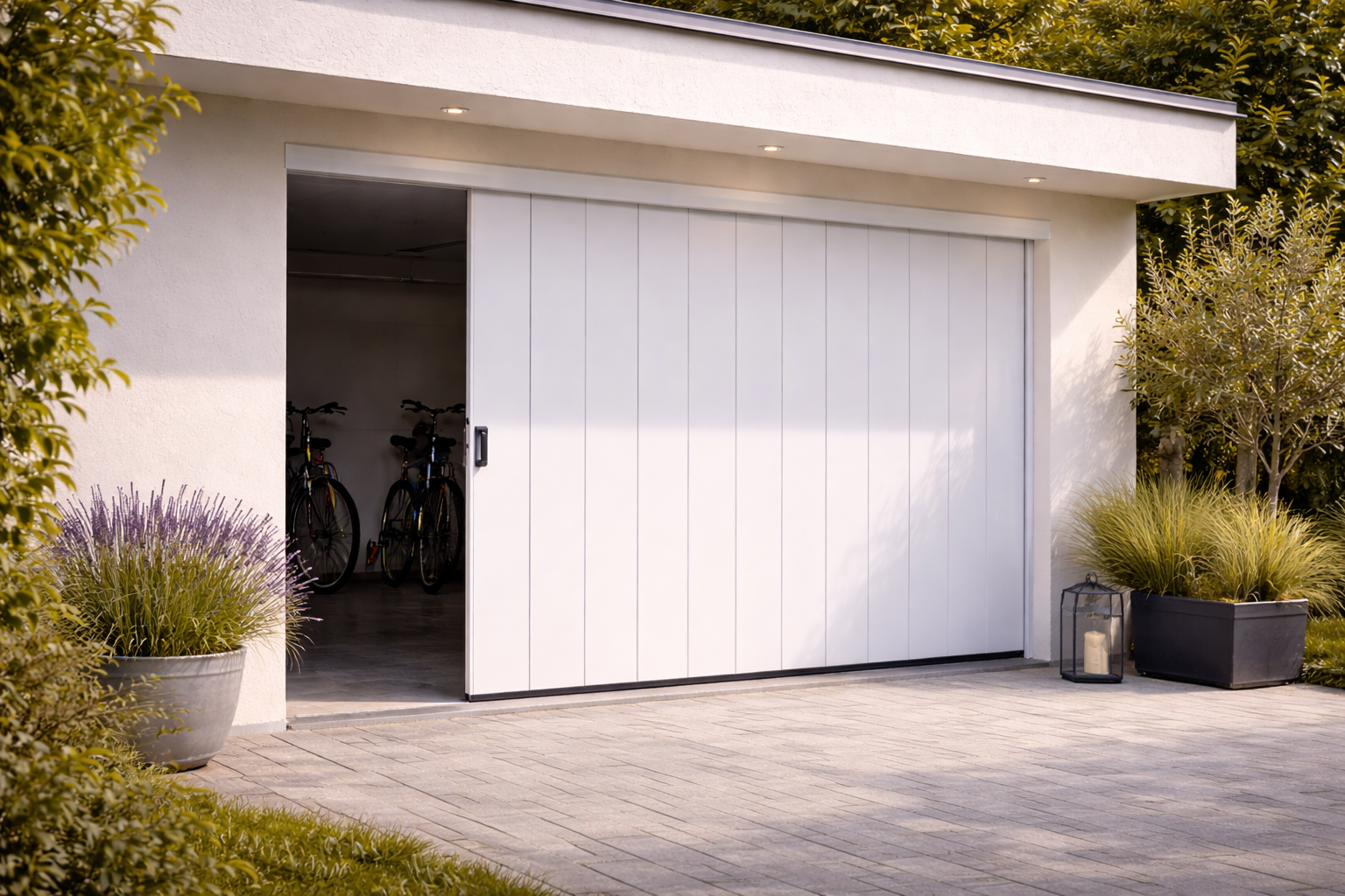 La porte de garage latérale Tryba s’ouvre sur le côté et coulisse le long du mur intérieur du garage. Ce système permet un accès rapide au garage sans avoir besoin d’ouvrir entièrement la porte. Robuste et pratique, ce type de porte de garage est idéal pour les garages disposant d’un plafond encombré ou d’une configuration particulière. Elle offre également un excellent confort d’utilisation au quotidien.